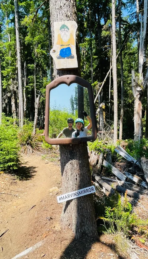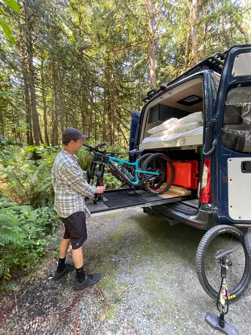 Arriving at Inland Lake, located in the heart of Powell River, BC, we are greeted by a mesmerizing sight. Surrounded by lush forests and crystal-clear waters, the lake beckons us to explore its tranquil serenity. The van's slide-out garage proves invaluable as we access our outdoor gear effortlessly. On this trip we opted for Mountain Bikes, Hiking Gear, AND of course the propane fire pit which means we could still have a fire, even during the fire ban.