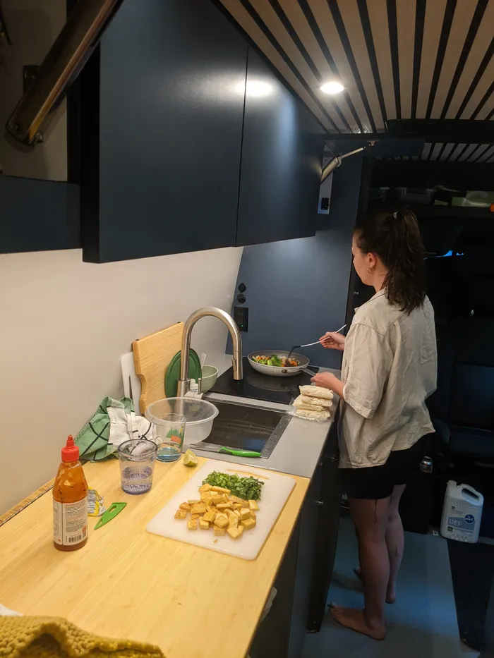 Inside the van, we find ourselves enveloped in opulence and convenience. The fully insulated cabin provides a cozy retreat, while the diesel heating system and hot water amenities offer a touch of indulgence. The fridge, induction cooktop, and well-equipped kitchen allow us to prepare gourmet meals even in the midst of the backcountry.